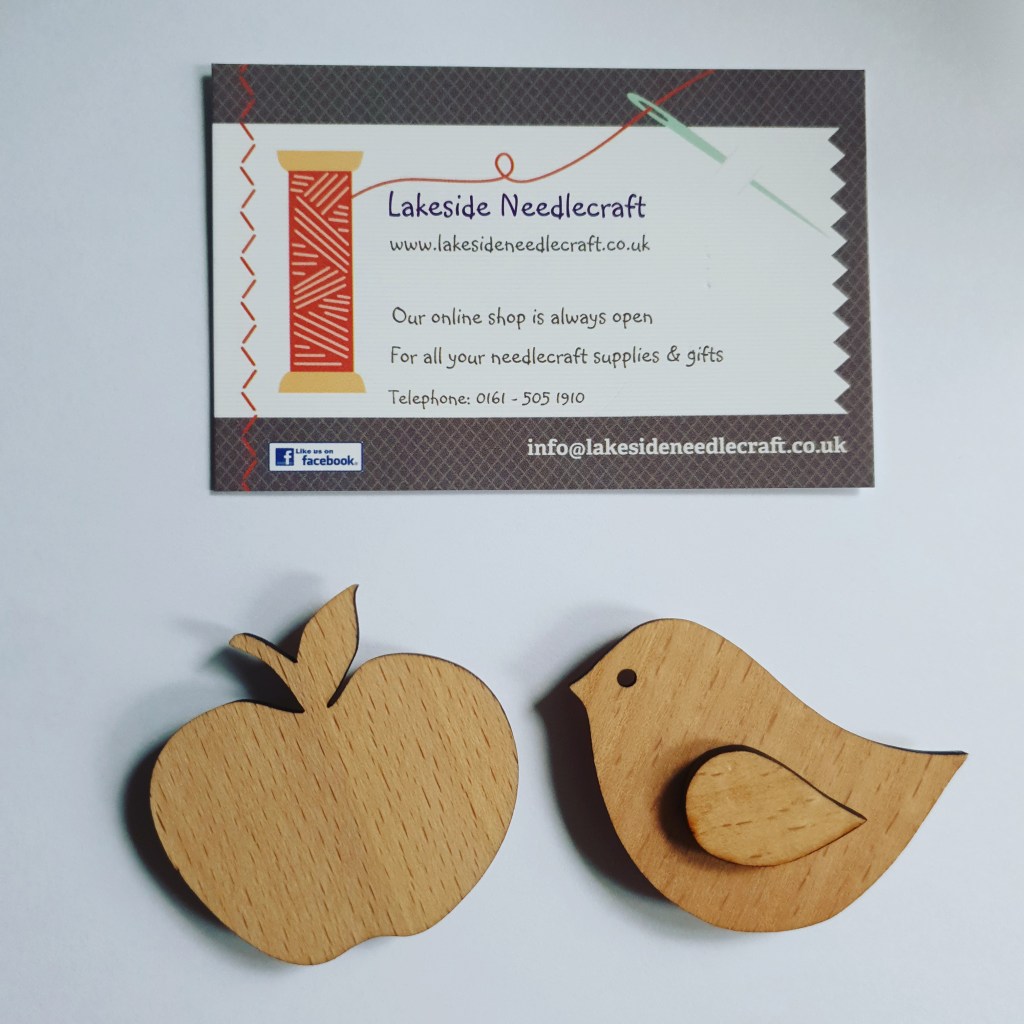 What is more, I received two new lovely needle minders with the book. I always order needle holders from Lakeside Needlecraft, and now I have two cats, a dog, a bird, and an apple in natural wooden colours.