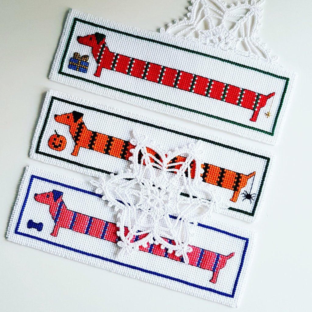 There are all three cross-stitched dog bookmarks here: the Dachshund with a bone, the Halloween dog with a pumpkin and a spider, and the Christmas one – with a gift and a star. I am curious which one do you like most?
