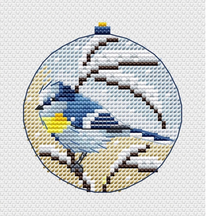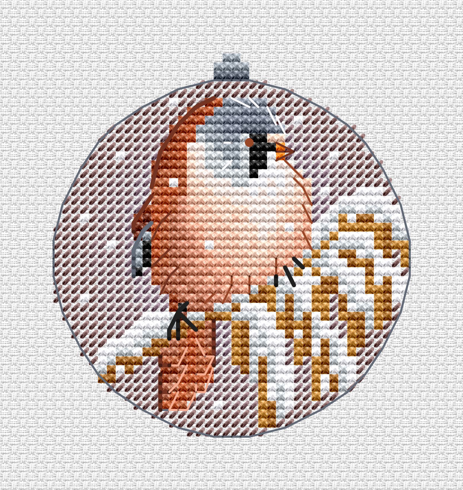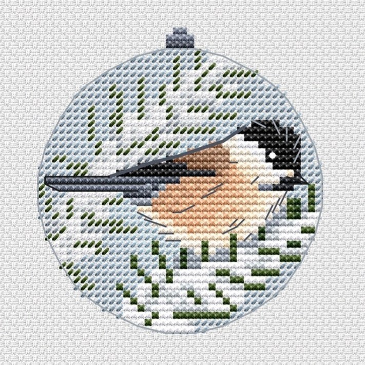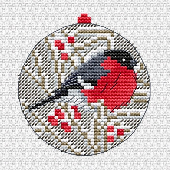 It is a European Goldfinch, one of the top-rated stitching birds among European cross stitchers. We plan to design Bullfinch and Cardinal on a Christmas Bubble too. Which one do you prefer?