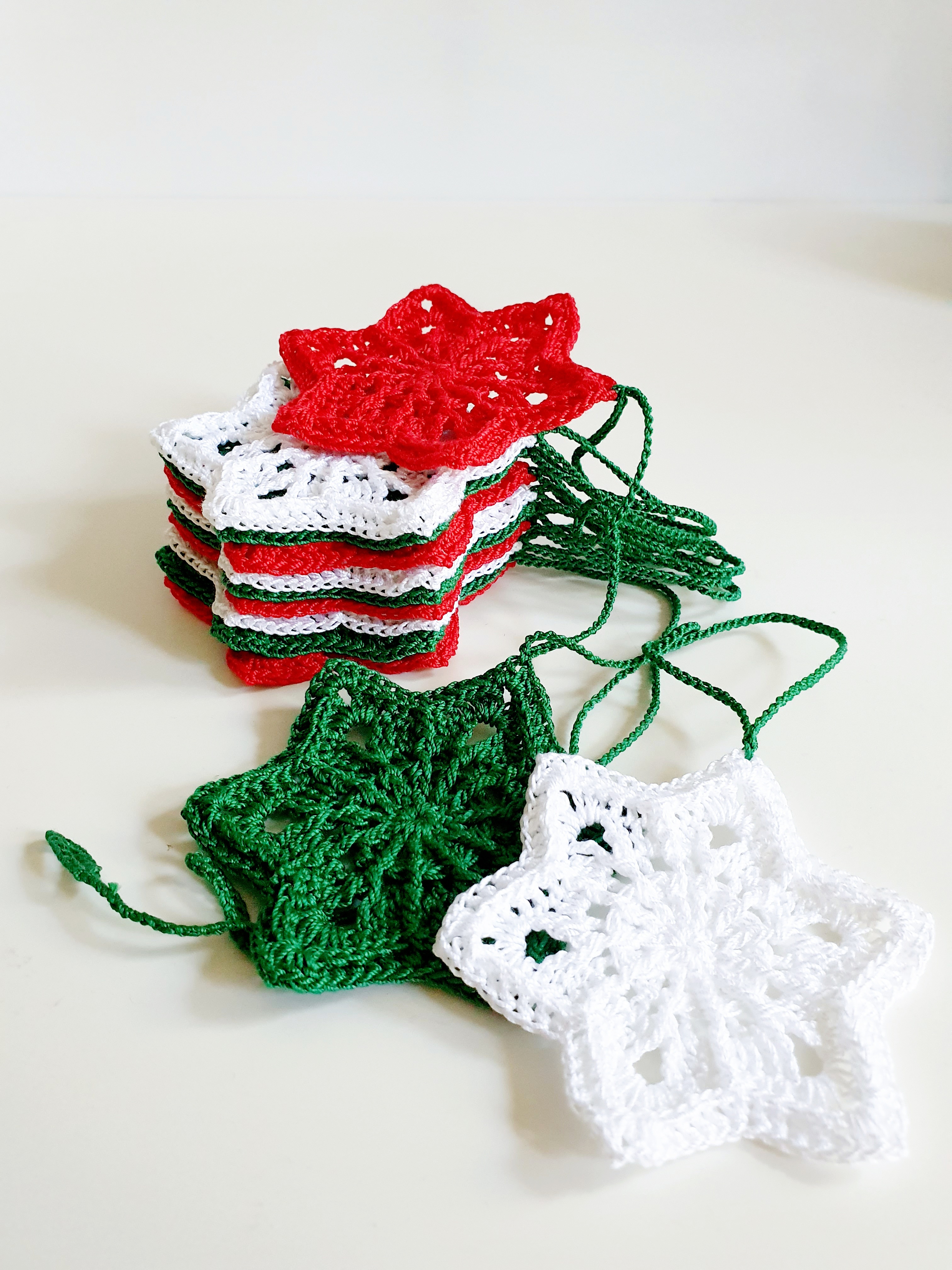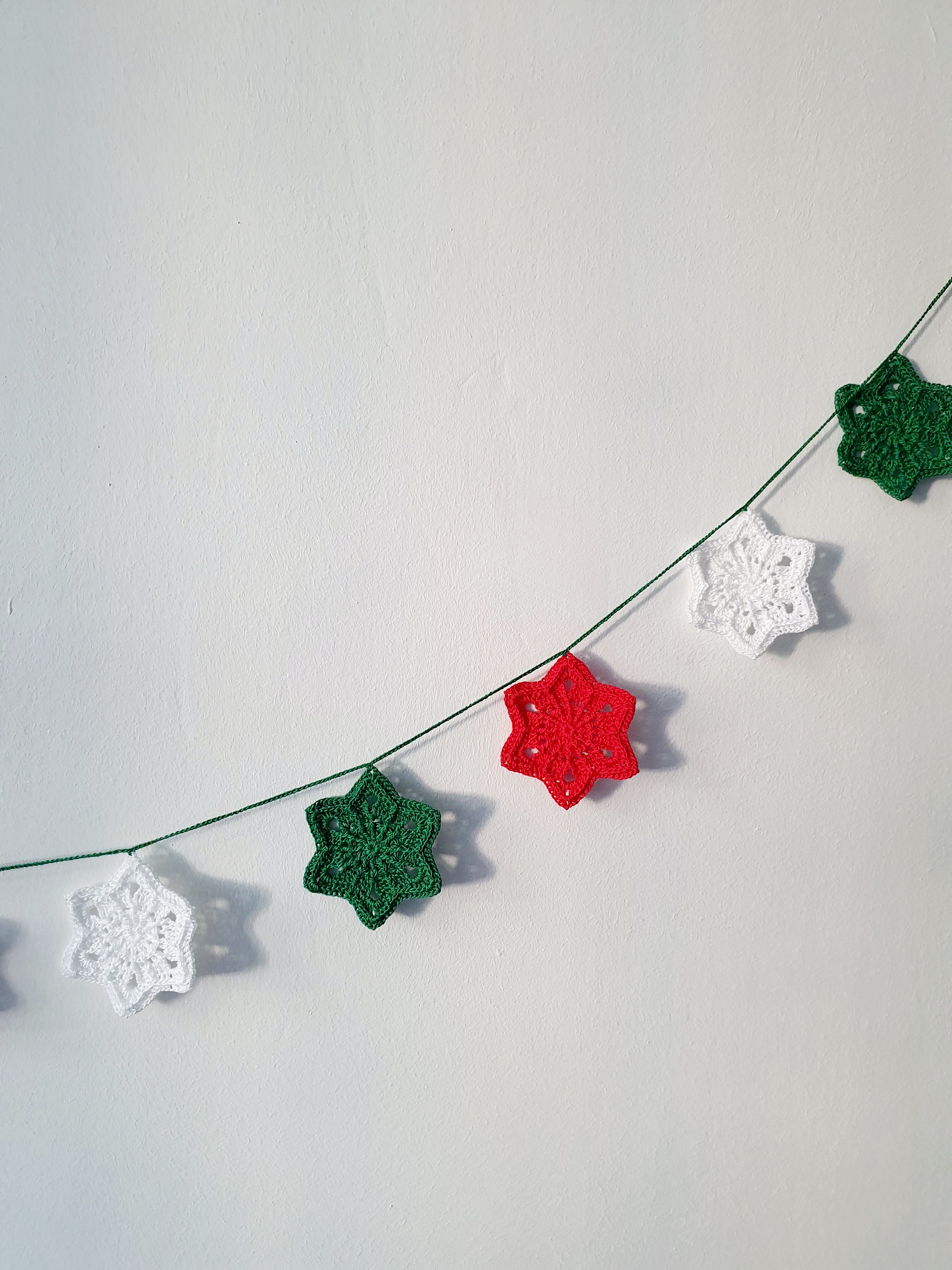 Because my main customers are from the USA and that delivery times before Christmas are doubling if not tripling, I decided to run a Christmas campaign in July. The first item I listed in the shop was a garland of multicoloured stars in the typical Christmas colours of dark green, red and white. The stars bunting made up of 14 stars with string, crocheted from 100% mercerized cotton yarn. The garland is perfect for home decoration all year round, especially on Christmas and New Year celebrations. You can use it in a baby room, kid’s room, bedroom, living room, fireplace, on the wall, as a Christmas table or Christmas tree decoration, for wedding decor or party decor also. The garland is 180 cm (70,8 inches) long, and a single star is 6,5 cm (2,5″) in diameter. There are small loops on the ends of the garland. If you like this idea but in a different length or colour scheme, drop us a message, and we’ll be happy to crochet it for you.