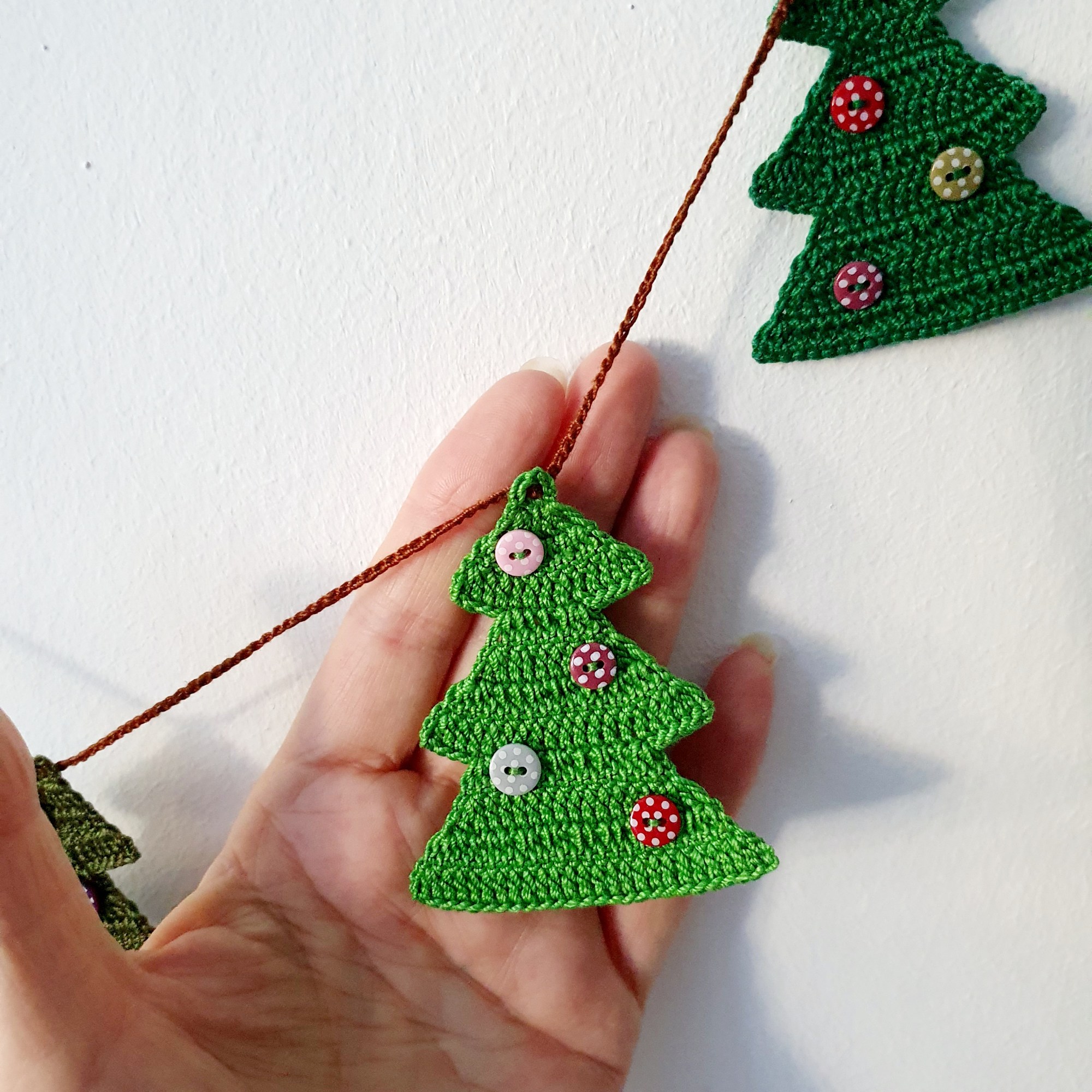 I just listed my new bunting at CrochetCabinetCrafts. The bunting crochet of twelve different green colour shades Christmas Trees, decorated with polka dot buttons. The garland is approximately 150 cm long; each tree is 6,5 cm in height. As for me, it is the funniest garland ever. Do you agree with me?