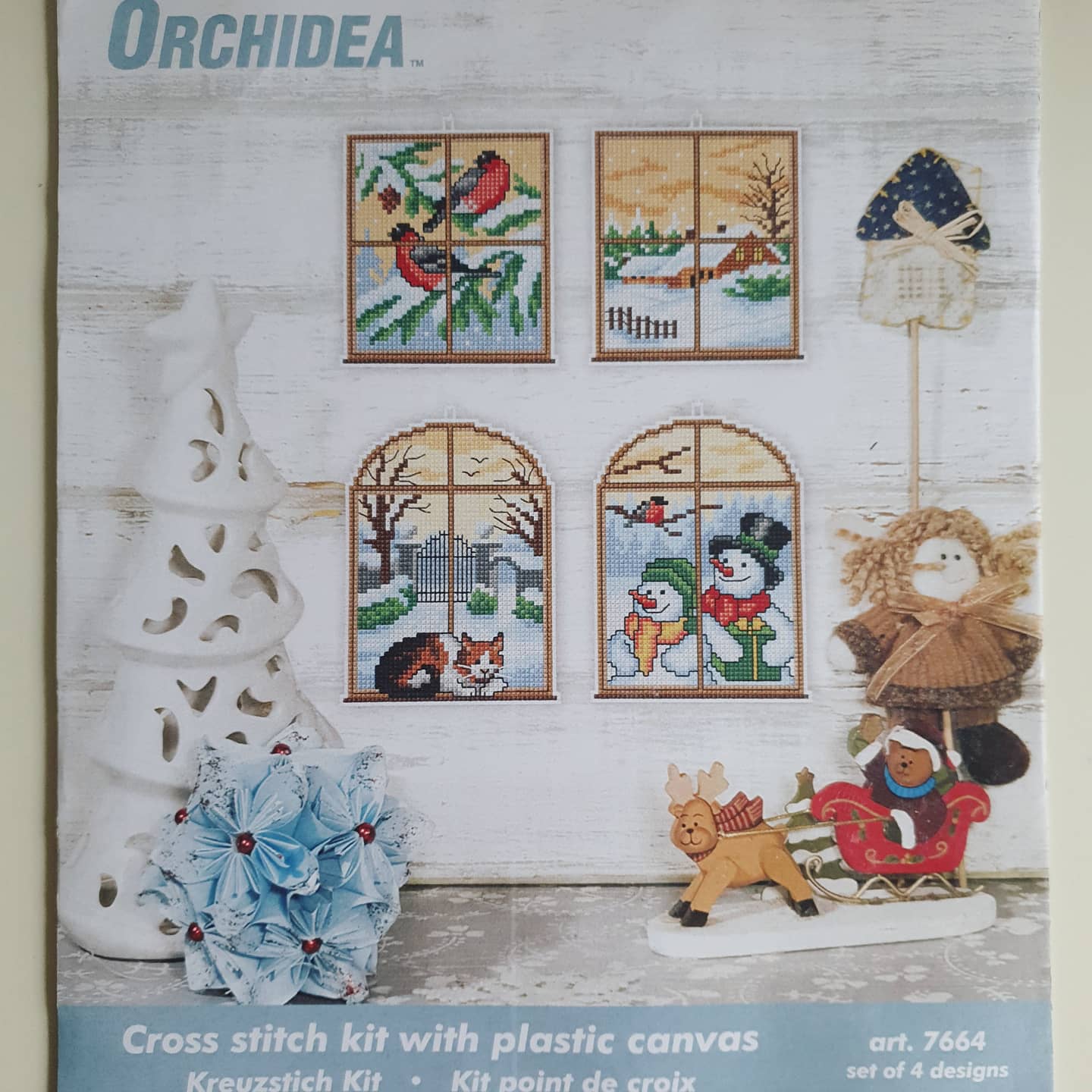 After completed my biggest and most difficult stitching, I decided to finish some of the projects, I’ve started and put in a drawer, and it turned out, that I have a lot of them. So, the first I’ve finished today is Christmas hanging decor from Orchidea Kit. This Kit contains plastic canvas, presorted MC thread, white-black chart and a needle. Two pictures from this Kit were completed earlier and they are in Newcastle, with my daughter. The last two will be here, in Warsaw, with me. So, I’d like to present you pictures of the Kit itself, the process and completed decoration: