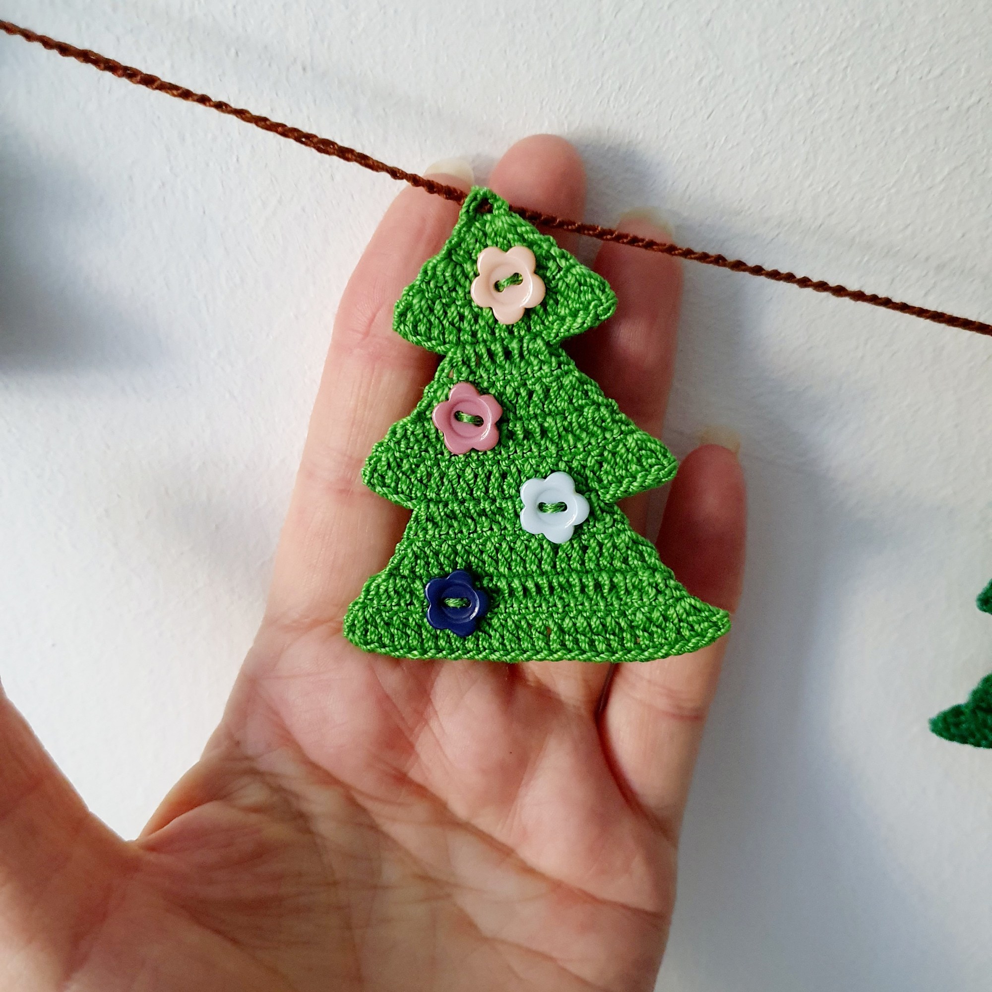 The last Christmas bunting at CrochetCabinetCrafts this year. No more Christmas garlands, because my main customers are from the USA. And we are well aware that delivery during the holidays is very problematic and takes much longer than usual. The bunting crochet of twelve different green colour shades Christmas Trees, decorated with buttons. The garland is approximately 150 cm long; each tree is 6,5 cm in height. I want to point out that this bunting is one of a kind. I have no more this type of buttons. Thus, I will be unable to repeat it next year.
