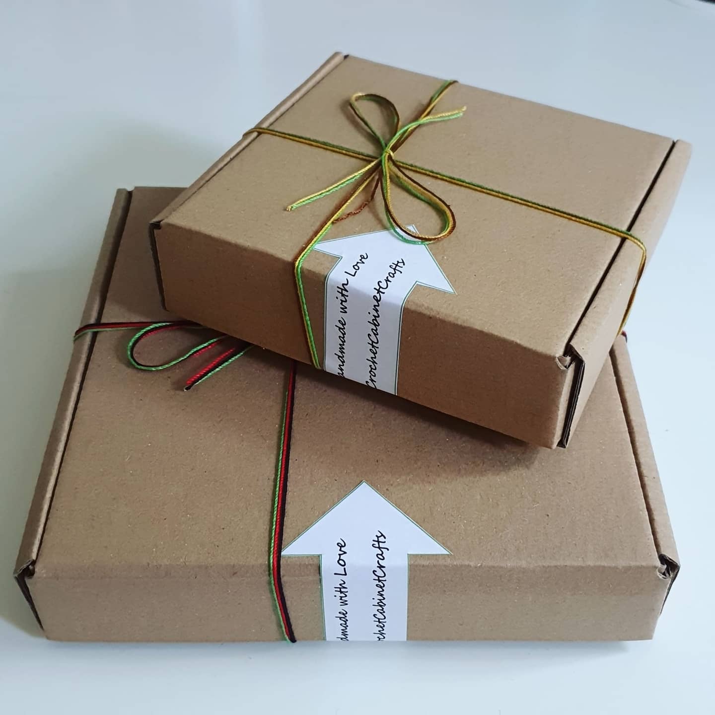Yesterday I packed and shipped orders to the USA: cities of Arvada, Colorado and Dublin, Virginia and today to Stamford, Lincolnshire, UK. They were sunflowers, daisies and poppies garlands. Business is booming, so I am making more garlands again. The packing looks like the picture in my house. I use several types of stickers: the small white ones are my favourite, I ordered them a lot in the UK for my old shop, and I still use them (I won’t throw them away), and the big brown ecological ones I ordered locally in Poland, I don’t like them very much. As soon as I finish them, I will purchase new ones in the UK with a new shop name. I made The stickers as arrows made by myself and stick the box so that the customer knows how to open it. I am proud of these stickers. What is your opinion about them? And at the end, I always tie the box with the threads that I used for crocheting the garland.