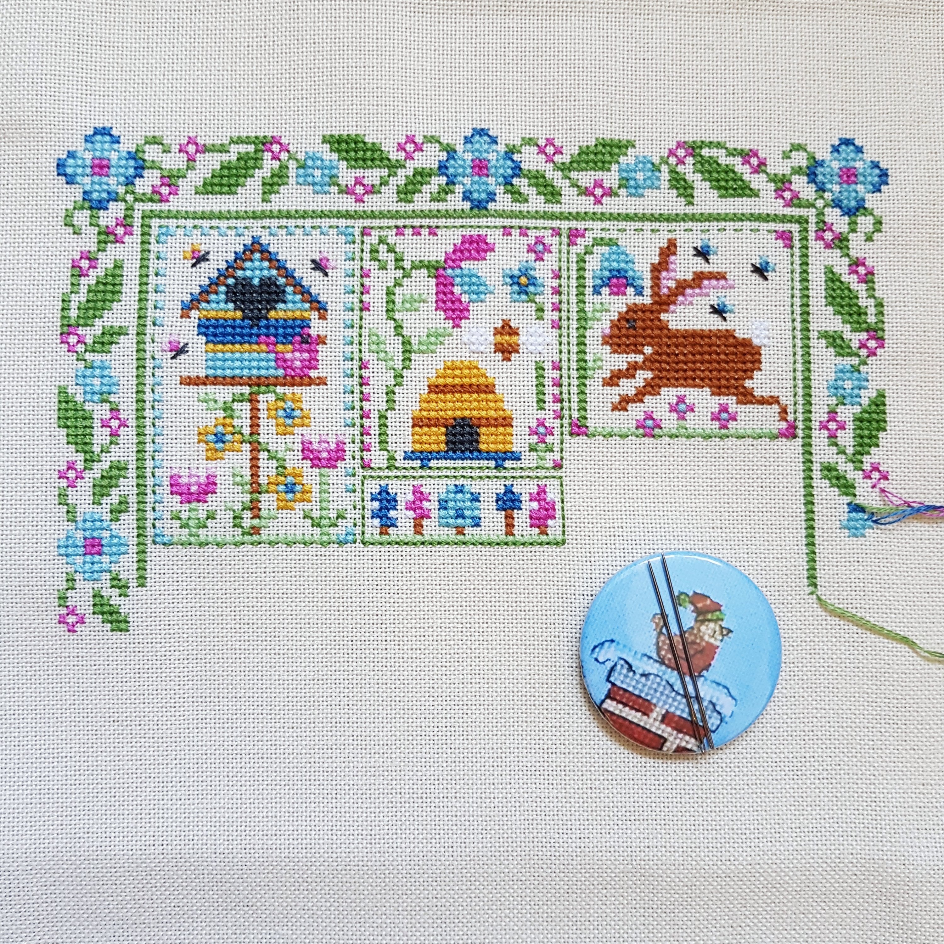 A few weeks ago Durene Jones published new Garden Sal as her weekly Friday freebie. Of course, I took part in it. This is the result of my work. There are the part of a border ( I hate stitch all the border straight away) and two parts – a birdhouse with a pink bird and three butterflies, and a beehive with sweet bee and flowers.