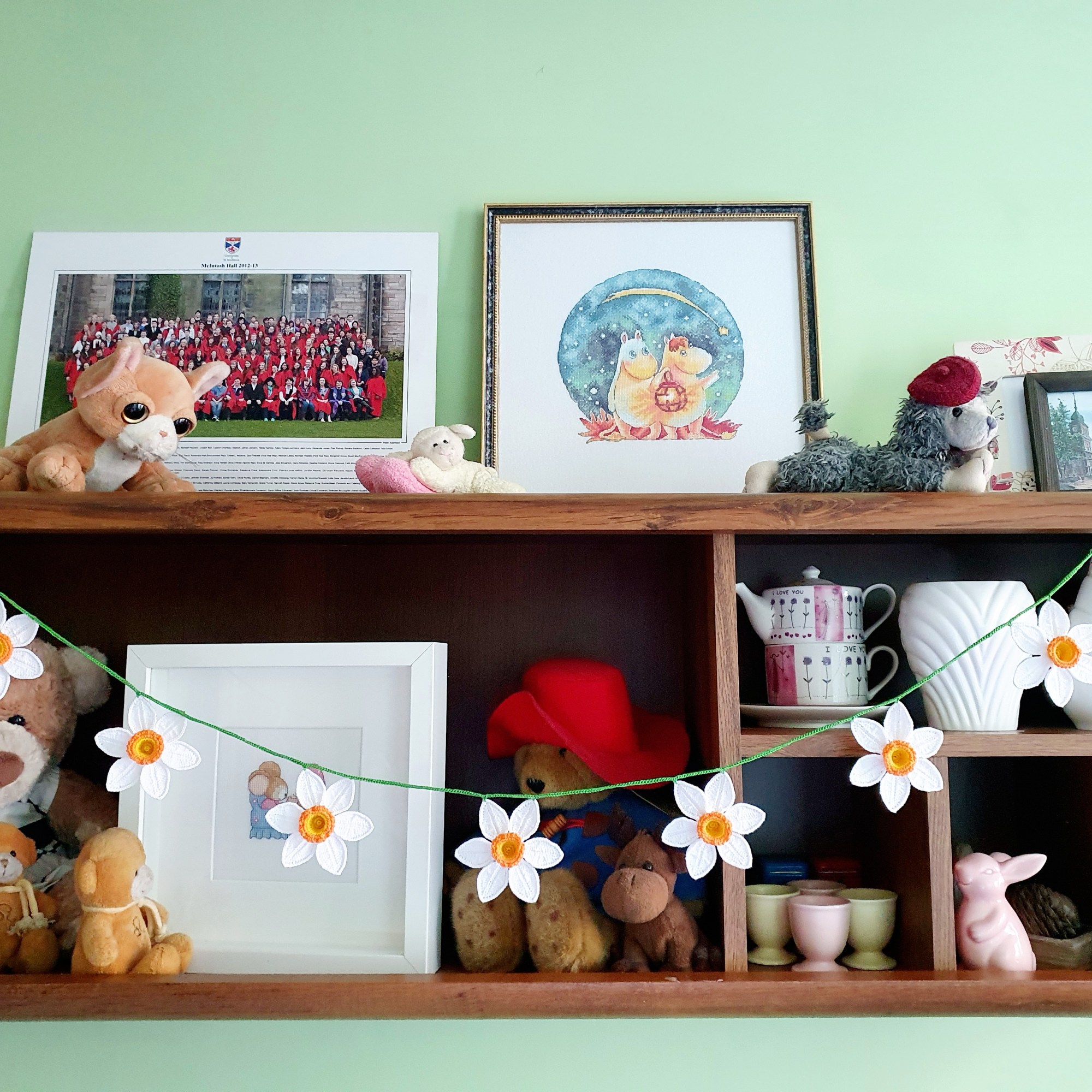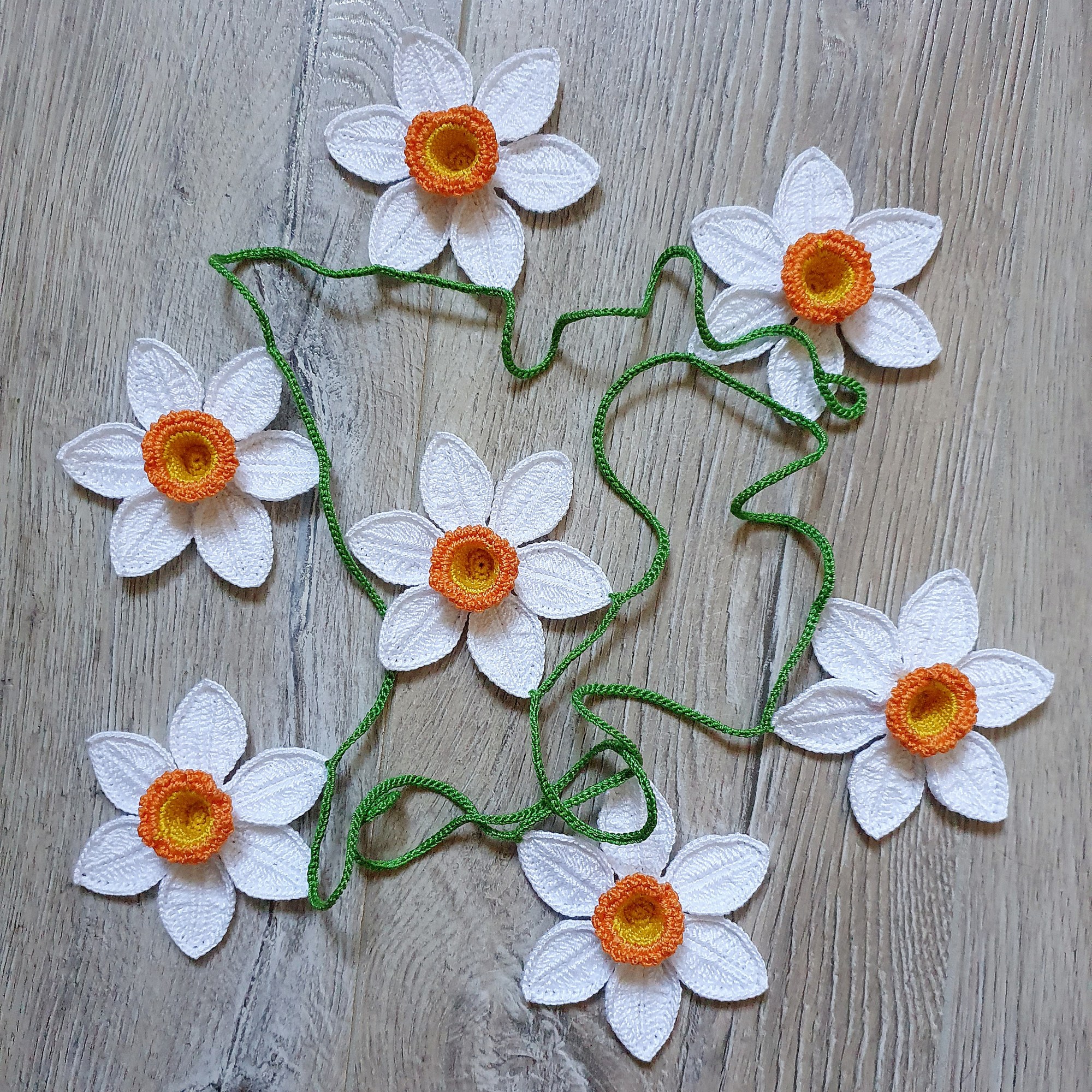 A new item at my shop! This hand-made daffodils bunting is made up of 7 yellow and 7 white flowers and thirteen double leaves with string, crocheted from 100% mercerized cotton yarn. The garland is perfect for home decoration all year round, it can be used in a baby room, kids’ room, bedroom, living room, fireplace, on the wall, as a table decoration or even outside – in the garden. It can be used for baby showers, wedding decor or party decor. The garland is 305 cm (120 inches) long, each flower is 8 cm (3,1 inches,) in diameter, and a leaf is 5 cm (2 inches) long. There are small loops on the ends of the garland. https://www.etsy.com/listing/1393497907/white-and-yellow-daffodils-120-bunting